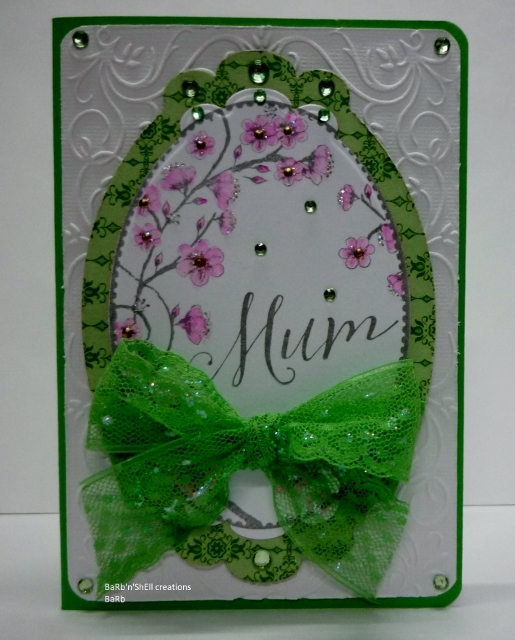 This card has a white shimmer card base. The white top layer had the sentiment and the intricate corner section die cut from it, and was then partially embossed, and matted on to red foil card. This was wrapped with spotted sheer white ribbon threaded through a rhinestone slide, then added to the card base. White, shimmer card, die cut butterflies with gemstone bodies were added, and pearls to the corners. The sentiment was highlighted with stickles.